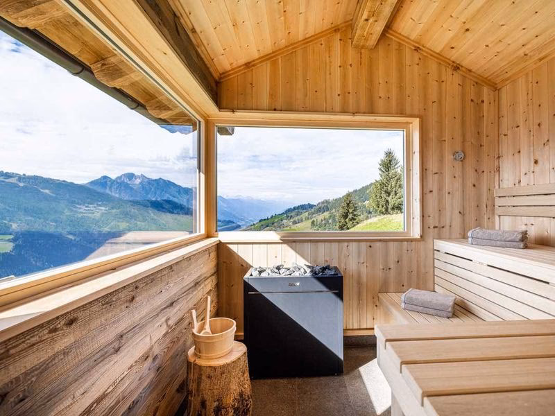 Ein absolutes Highlight ist der private Hot Tub im Freien. Egal ob unter einem klaren Sternenhimmel oder umgeben von der winterlichen Schneelandschaft – das warme Wasser wirkt Wunder für verspannte Muskeln und den Geist. Es ist ein unvergessliches Erlebnis, bei dem Sie die frische Bergluft genießen und gleichzeitig in wohliger Wärme baden können. Für die vollkommene Entspannung steht Ihnen zudem eine private Zirbenholzsauna zur Verfügung. Das duftende Zirbenholz verströmt einen angenehmen, beruhigenden Geruch, der die Atemwege befreit und den Kreislauf anregt. Das Besondere daran: Die Sauna verfügt über ein Panoramafenster, das Ihnen während des Saunierens einen atemberaubenden Blick auf die umliegende Bergwelt ermöglicht. So wird der Saunagang zu einem visuellen und körperlichen Genuss.