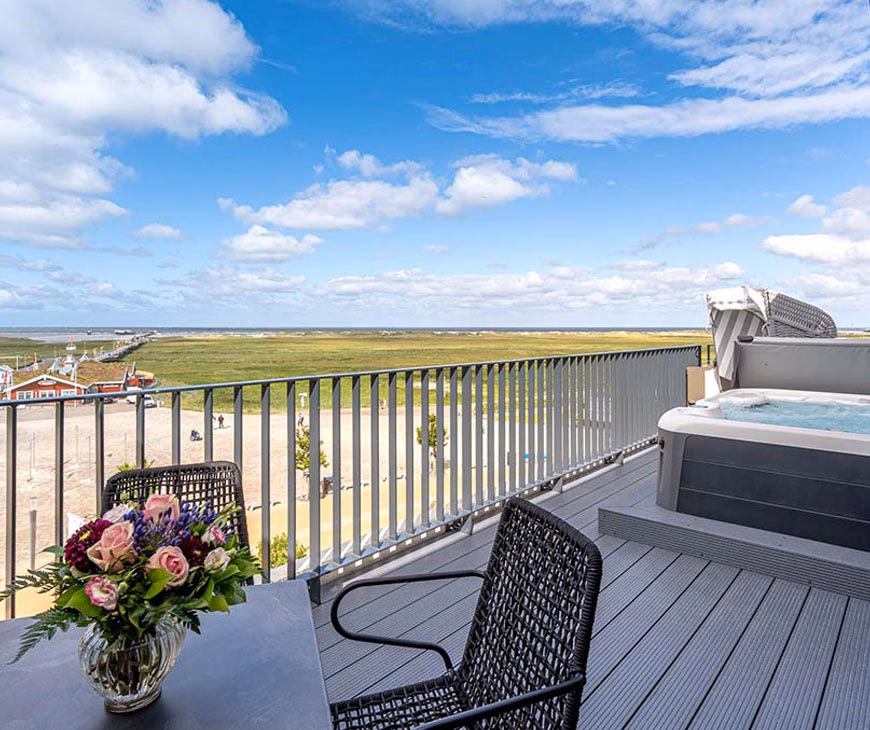 Ein absolutes Highlight und eine Besonderheit des Auramaris Spas sind die luxuriösen Whirlpoolwannen auf der Dachterrasse des Hauses. Stellen Sie sich vor, wie Sie in warmem, sprudelndem Wasser liegen, während Sie eine fantastische, unvergleichliche Aussicht auf die Weiten der Nordsee genießen. Dieses Erlebnis, das bei Sonnenuntergang besonders magisch ist, bietet eine einzigartige Kombination aus Entspannung und Naturverbundenheit und ist gegen Gebühr buchbar. Es ist der perfekte Ort, um den Tag ausklingen zu lassen und die Seele baumeln zu lassen, umgeben von der beruhigenden Geräuschkulisse des Meeres.