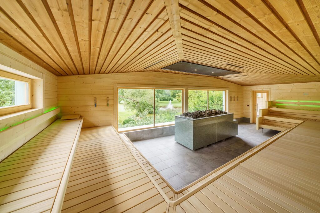 Die klassische Innensauna ist ein Ort der Ruhe und Besinnung. Bei traditionellen Saunatemperaturen und einer angenehmen Luftfeuchtigkeit können Sie hier tief durchatmen und den Alltag hinter sich lassen. Das besondere Highlight ist das sanfte Vogelgezwitscher, das eine natürliche, beruhigende Atmosphäre schafft und Sie in eine fast meditative Stimmung versetzt.