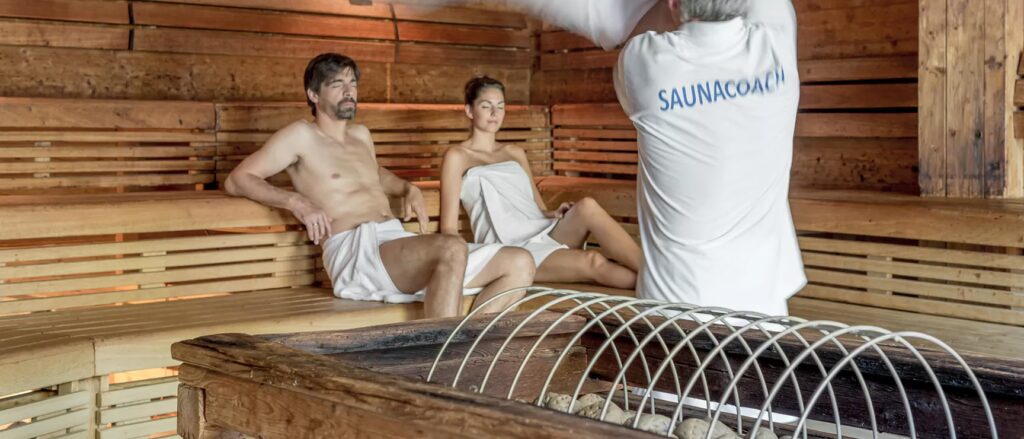 | Was ist ein „Aufguss“? | Ein Aufguss ist ein Ritual, bei dem Wasser (oft mit ätherischen Ölen) auf die heißen Saunasteine gegossen wird, um Dampf zu erzeugen. Ein „Saunameister“ verteilt die heiße Luft mit einem Handtuch. Erleben Sie ihn unbedingt, aber verhalten Sie sich währenddessen ruhig. |