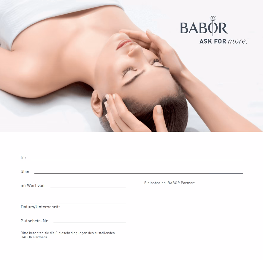 - Immer passend: Egal ob für Beauty-Kenner oder Neulinge in der Welt der hochwertigen Pflege, ein BABOR Gutschein ist immer eine willkommene Überraschung. Er eröffnet die Tür zu einer Welt der professionellen Hautpflege, die vielleicht bisher unentdeckt blieb.