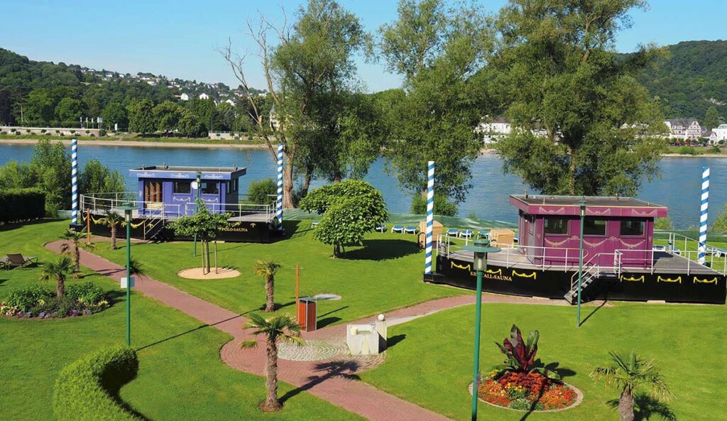 Mit stilvollem Marmor und kunstvollen türkischen Ornamenten ausgestattet, sind die Saunen nicht nur Orte der Entspannung, sondern auch der Attraktivität. Hier kann man die Seele baumeln lassen und die wohltuende Wirkung der Sauna bei einem atemberaubenden Blick auf den Rhein genießen.