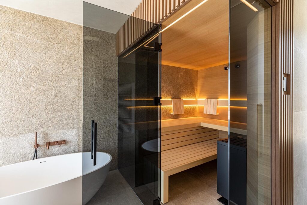 Indirekte Beleuchtung, oft realisiert durch LED-Streifen, die hinter Verkleidungen, unter Bänken oder in Nischen versteckt sind, schafft eine sanfte, blendfreie und sehr stimmungsvolle Beleuchtung. Sie lässt den Raum größer und einladender wirken und ist perfekt, um eine entspannende Atmosphäre im gesamten Badezimmerbereich zu erzeugen, inklusive des Vorraums zur Sauna.