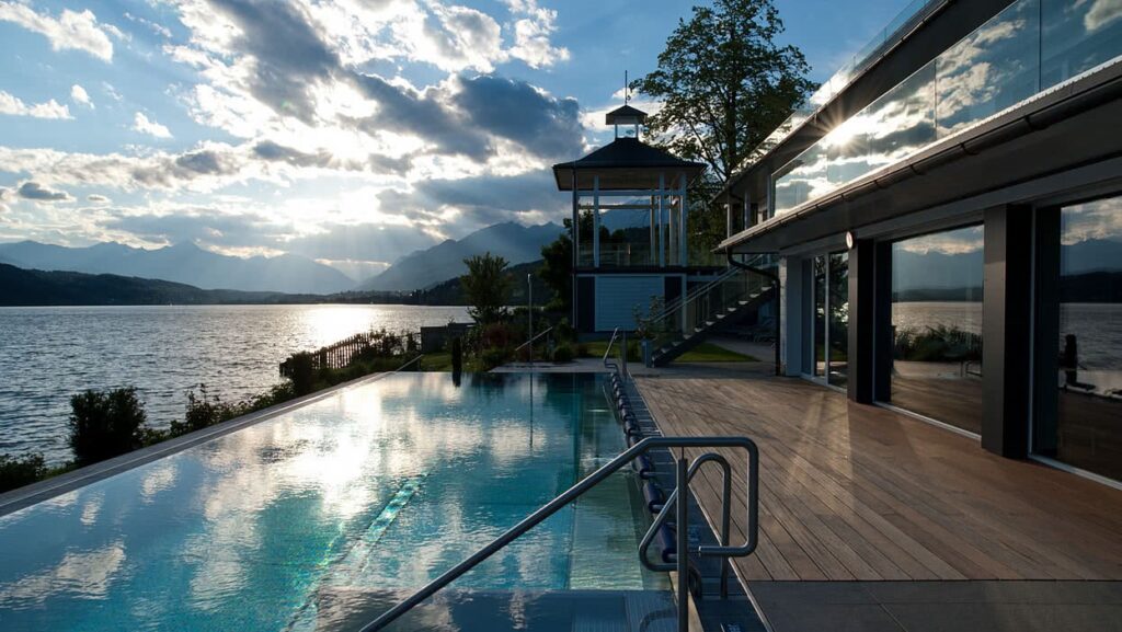 Das Kärnten Badehaus erstreckt sich über eine beeindruckende Erholungsfläche von über 3.900 m², die ein umfassendes Wellness-Angebot inklusive eines Infinity-Pools umfasst.
