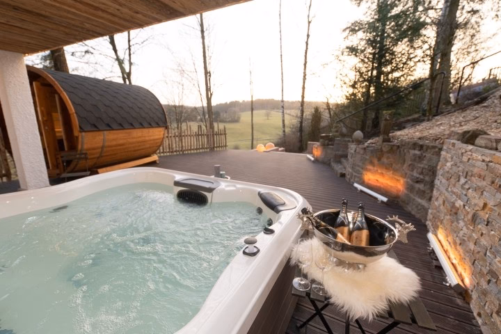 Der Whirlpool ist ein Ort des puren Genusses. Das sprudelnde, warme Wasser massiert sanft die Haut und lockert Verspannungen. Ob unter dem Sternenhimmel oder umgeben von der Stille des Waldes – ein Bad im privaten Whirlpool ist ein sinnliches Erlebnis, das den Stress des Alltags vergessen lässt. Ergänzt wird dies oft durch eine Regenwalddusche, die mit ihren sanften, aber kräftigen Wasserstrahlen ein Gefühl von Frische und Lebendigkeit vermittelt, als würden Sie unter einem tropischen Wasserfall stehen.