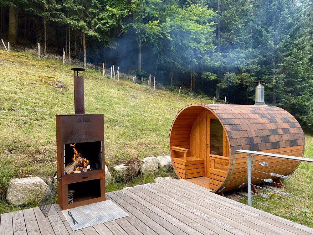 Nach einem ereignisreichen Tag in der Natur oder einem ausgiebigen Kochabend gibt es nichts Besseres, als sich in einem privaten Wellnessbereich zu entspannen. Seit einigen Monaten können Sie in unseren beiden Ferienobjekten auch eine exklusive Schwitzstube (Sauna) buchen. Beide Wohnungen teilen sich einen außergewöhnlich großen Wellnessbereich von zusammen 90 Quadratmetern – eine Größe, die man selten in einem privaten Domizil findet.