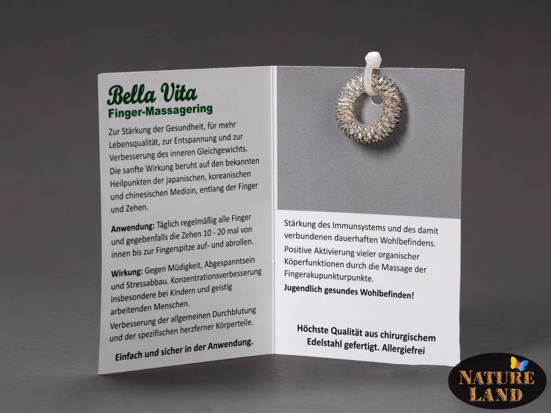 Ein Fingermassagering, oft auch als Su-Jok-Ring, ArthroRoller oder Ying Yang Ring bezeichnet, ist ein kleines, aber hochwirksames Werkzeug zur Stimulation der Finger-Reflexzonen. Er besteht typischerweise aus elastischem Spezial-Federstahl, dessen kräftige Windungen oder Noppen beim Auf- und Abrollen über den Finger einen gleichmäßigen und intensiven Massage-Effekt erzeugen. Diese spezielle Bauweise ermöglicht es dem Ring, sich optimal an verschiedene Fingerdicken anzupassen und somit eine gezielte und effektive Massage zu gewährleisten.