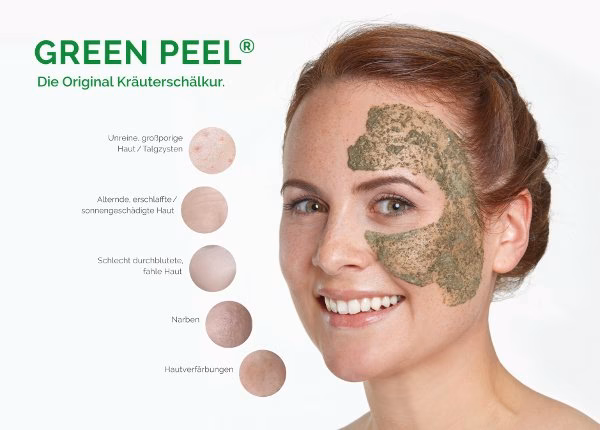 GREEN PEEL® ist eine rein natürliche Kräuterschälkur, die die Hautregeneration anregt. Eine Mischung aus Kräutern, Enzymen, Vitaminen und Mineralien wird einmassiert, was einen Schälprozess auslöst und die Haut zur Bildung neuer Zellen anregt.