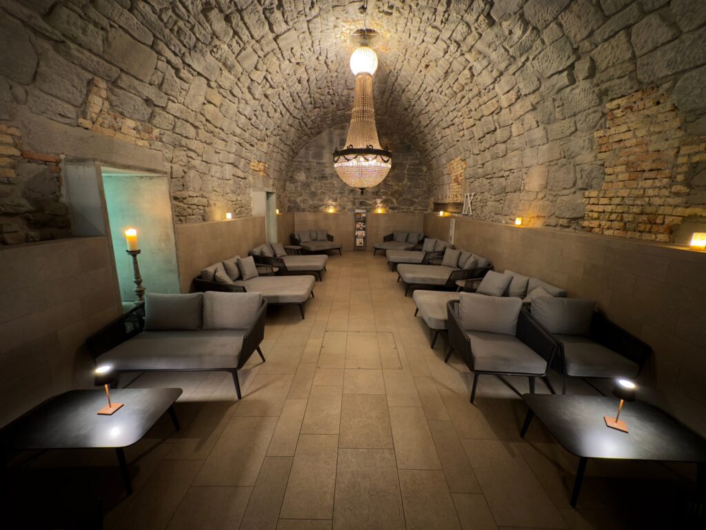 Das Herzstück des Spas ist das zentrale Thermalbad, das sich in einem beeindruckenden, riesigen Holzbecken befindet. Auf den ersten Blick mag das Holzbecken neuartig erscheinen, doch es ist eine bewusste Hommage an die Ursprünge des Hauses als Brauerei. Die Steinwände verleihen dem Raum ein römisch-antikes Flair, während geschickt platzierte Lichtakzente eine warme und entspannte Atmosphäre schaffen. Hier können Sie die wohltuende Wirkung des Aqui-Thermalwassers in vollen Zügen geniessen. Ausgestattet mit Massagedüsen, Sprudelliegen und einem Whirlpool, bietet dieses Bad alles, um selbst Ihre 656 Muskeln vollständig zu entspannen – ja, Sie haben richtig gehört, es gibt so viele! Lassen Sie sich von den sanften Bläschen umschmeicheln und spüren Sie, wie die Wärme des Wassers jede Anspannung aus Ihrem Körper weicht.