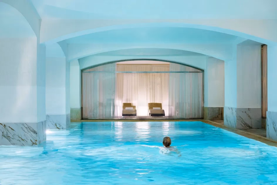 Der elegante Innenpool ist ein Ort der Ruhe und Erfrischung. Mit seinem klaren, beheizten Wasser lädt er zu entspannten Bahnen oder einfach zum Treibenlassen ein. Das Design des Poolbereichs ist eine Augenweide, mit beruhigenden Farben und natürlichem Licht, das durch geschickte architektonische Elemente einfällt. Angrenzend an den Pool befindet sich ein luxuriöser Whirlpool, dessen sprudelndes Wasser müde Muskeln lockert und Verspannungen löst. Die Kombination aus Wärme und sanfter Massage fördert die Durchblutung und trägt maßgeblich zur tiefen Entspannung bei. Beide Bereiche sind Teil des kostenlosen Zugangs und bieten eine perfekte Ergänzung zu den Behandlungen.