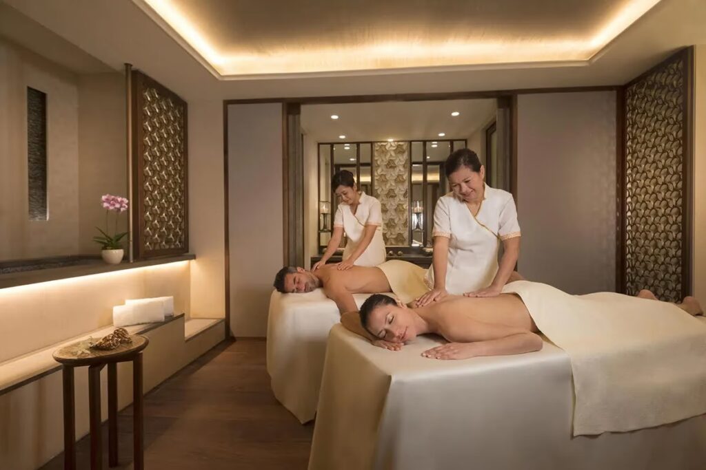Willow Stream Spa im Fairmont Singapore: Eine luxuriöse urbane Oase, die östliche und westliche Spa-Philosophien vereint. Mit 23 Behandlungsräumen, darunter Paarsuiten, bietet es authentische Massagen, Körperbehandlungen und Gesichtsbehandlungen mit Premium-Produkten. Separate Entspannungsbereiche für Männer und Frauen mit Saunen, Dampfbädern und Jacuzzis stehen zur Verfügung. Ein 50.000 Quadratmeter großes Fitnessstudio rundet das Angebot ab. Körpermassagen beginnen bei 180 S$ für 60 Minuten.