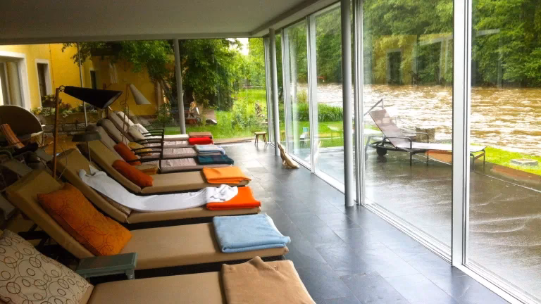 Besonders zur Entspannung tragen die Verwendung natürlicher Materialien wie Fichten-, Tannen-, Eichen- und Akazienholz, die sorgfältig ausgewählten Farben (Moosgrün, Zinnoberrot), die hellen und lichtdurchfluteten Räume, sowie die privaten Balkone und Terrassen mit Fluss- oder Waldblick bei. Die komfortablen Betten, die Möglichkeit zum Ausleihen eines Bademantels und die ruhige Nichtraucher-Umgebung runden das Angebot ab, das eine ganzheitliche Erholung ermöglicht.