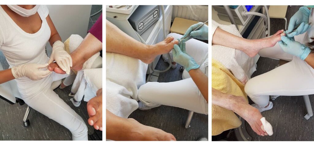2. Hygienemaßnahmen: Die Füße werden gründlich gereinigt und desinfiziert. Der Podologe arbeitet stets unter strengsten Hygienevorschriften und verwendet sterilisierte Instrumente.