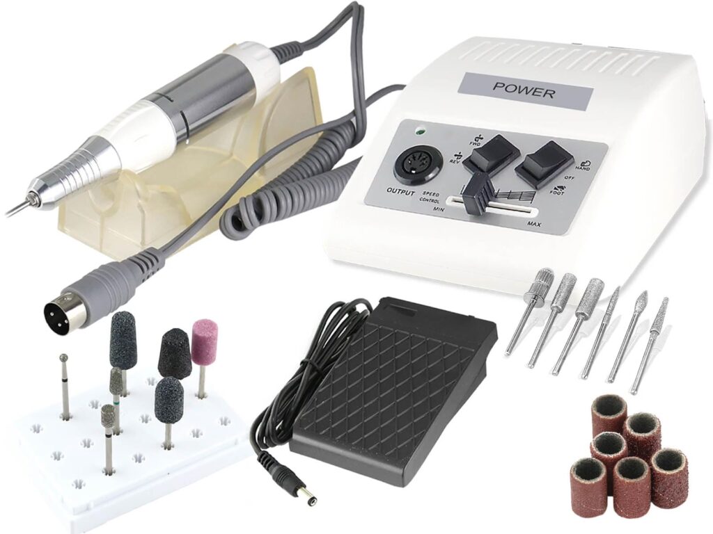 - Stufenlos einstellbare Geschwindigkeit: Dies ermöglicht eine flexible Anpassung an unterschiedliche Behandlungen und Haut-/Nagelzustände.