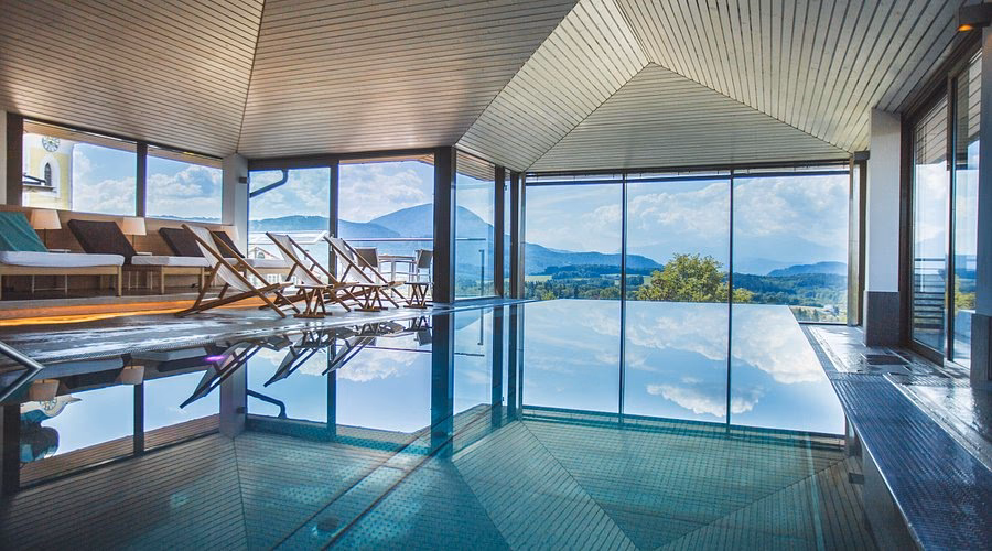 Beginnen Sie Ihr Wellness-Erlebnis im einladenden Innen- und Outdoorpool. Gleiten Sie durch das angenehm temperierte Wasser und lassen Sie sich von der sanften Strömung tragen. Der nahtlose Übergang vom Innenbereich ins Freie ermöglicht es Ihnen, selbst an kühleren Tagen die frische Bergluft zu genießen, während Sie im warmen Wasser schweben. Von hier aus bietet sich oft ein malerischer Blick auf die umliegende Alpenlandschaft, der die Entspannung zusätzlich vertieft.
