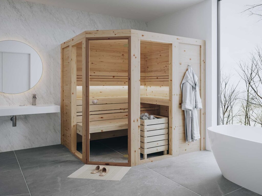 Die Massivholz-Elementsauna Kemi Eck ist speziell dafür konzipiert, sich harmonisch in bestehende Wohnräume einzufügen. Ihre Eckform ist nicht nur ein optisches Highlight, sondern auch äußerst platzsparend. Dies macht sie ideal für kleinere Räume oder Nischen, in denen eine gerade Sauna zu viel Platz einnehmen würde. Doch die Kemi Eck überzeugt nicht nur durch ihr Design, sondern auch durch ihre durchdachte Innenausstattung, die auf maximale Bequemlichkeit ausgelegt ist.