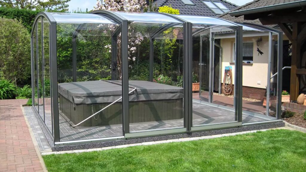 • Hohe Überdachungen: Diese bieten genügend Raum für Bewegungsfreiheit und Entspannung rund um den Whirlpool, fast wie ein kleiner Wintergarten, in dem Sie sich frei bewegen können.