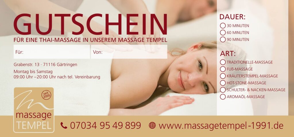 Verspannungen müssen nicht zu Ihrem ständigen Begleiter werden. Mit der richtigen Massagetechnik können Sie nicht nur akute Beschwerden lindern, sondern auch präventiv wirken und Ihr allgemeines Wohlbefinden erheblich steigern. Ob eine gezielte Rücken- und Nackenmassage, eine intensive Deep Tissue Behandlung oder eine wohltuende Hot Stone Massage – die Welt der Massagen bietet vielfältige Möglichkeiten, um Ihren Körper zu entspannen und Ihren Geist zur Ruhe zu bringen. Investieren Sie in sich selbst und entdecken Sie die transformative Kraft der professionellen Massage. Ihr Körper wird es Ihnen danken!