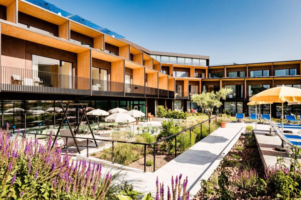 Das architektonische Konzept des Thalhofs ist eine Hommage an die umgebende Natur. Das luftige Gebäude imponiert seinen Gästen mit großflächigen Panoramafenstern, die nicht nur das Tageslicht tief ins Innere leiten, sondern auch atemberaubende Ausblicke auf die facettenreiche Gartenanlage und die umliegenden Weinberge freigeben. Stellen Sie sich vor, wie Sie morgens erwachen und der erste Blick auf die sanften Hügel fällt, die sich im goldenen Licht der Sonne präsentieren, oder wie Sie am Abend bei einem Glas Wein den Sonnenuntergang über den Reben genießen. Diese visuelle Verbindung zur Natur ist ein fester Bestandteil des Wohlbefindens, das der Thalhof seinen Gästen verspricht. Es ist ein Ort, an dem die Grenzen zwischen Innen und Außen verschwimmen und die Schönheit der Südtiroler Landschaft zum ständigen Begleiter wird.