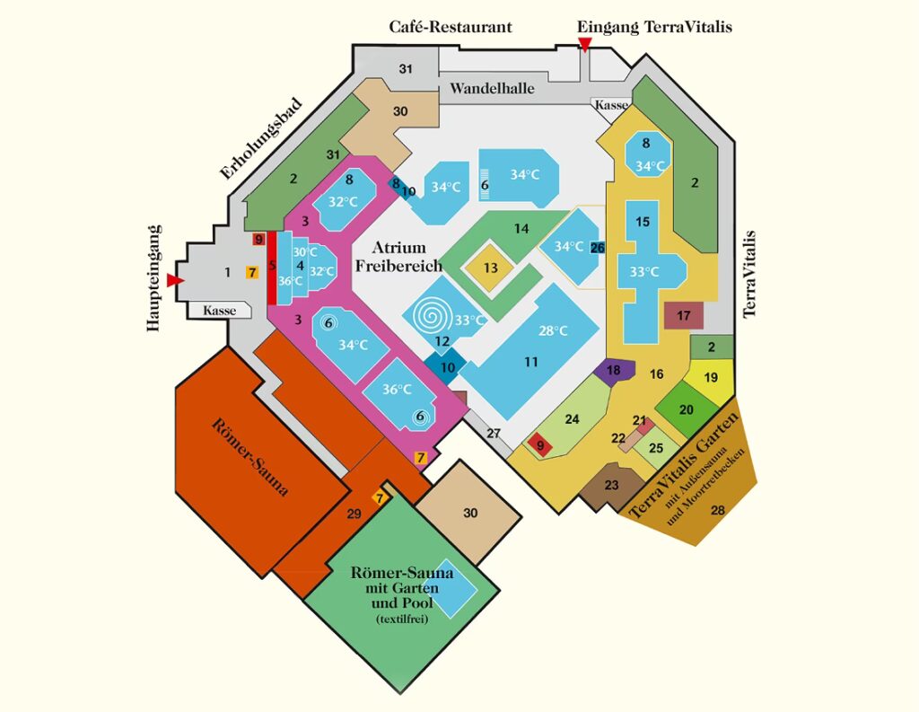 | Frigidarium | Kaltwasserraum | Erfrischend, fördert die Durchblutung und das Immunsystem |
