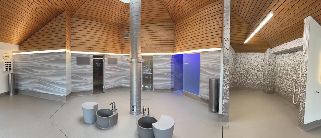 Ein besonderes Highlight ist die neu renovierte Blockhaus-Sauna im Aussenbereich des Saunaparks. Hier verschmilzt das traditionelle Saunaerlebnis mit der Frische der Aussenluft. Die Blockhaus-Sauna bietet eine rustikale und authentische Atmosphäre und ist mit einer automatischen Aufgussanlage ausgestattet. Dies garantiert ein gleichbleibend intensives und angenehmes Aufgusserlebnis, ohne dass Sie sich um manuelle Aufgüsse kümmern müssen. Der Wechsel zwischen der Hitze der Blockhaus-Sauna und der kühlen Aussenluft ist ein belebendes Erlebnis, das die Durchblutung anregt und das Immunsystem stärkt.